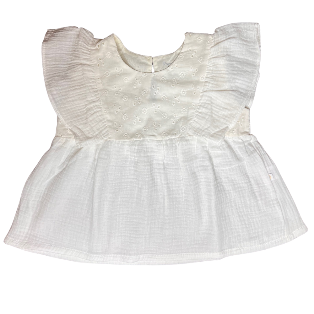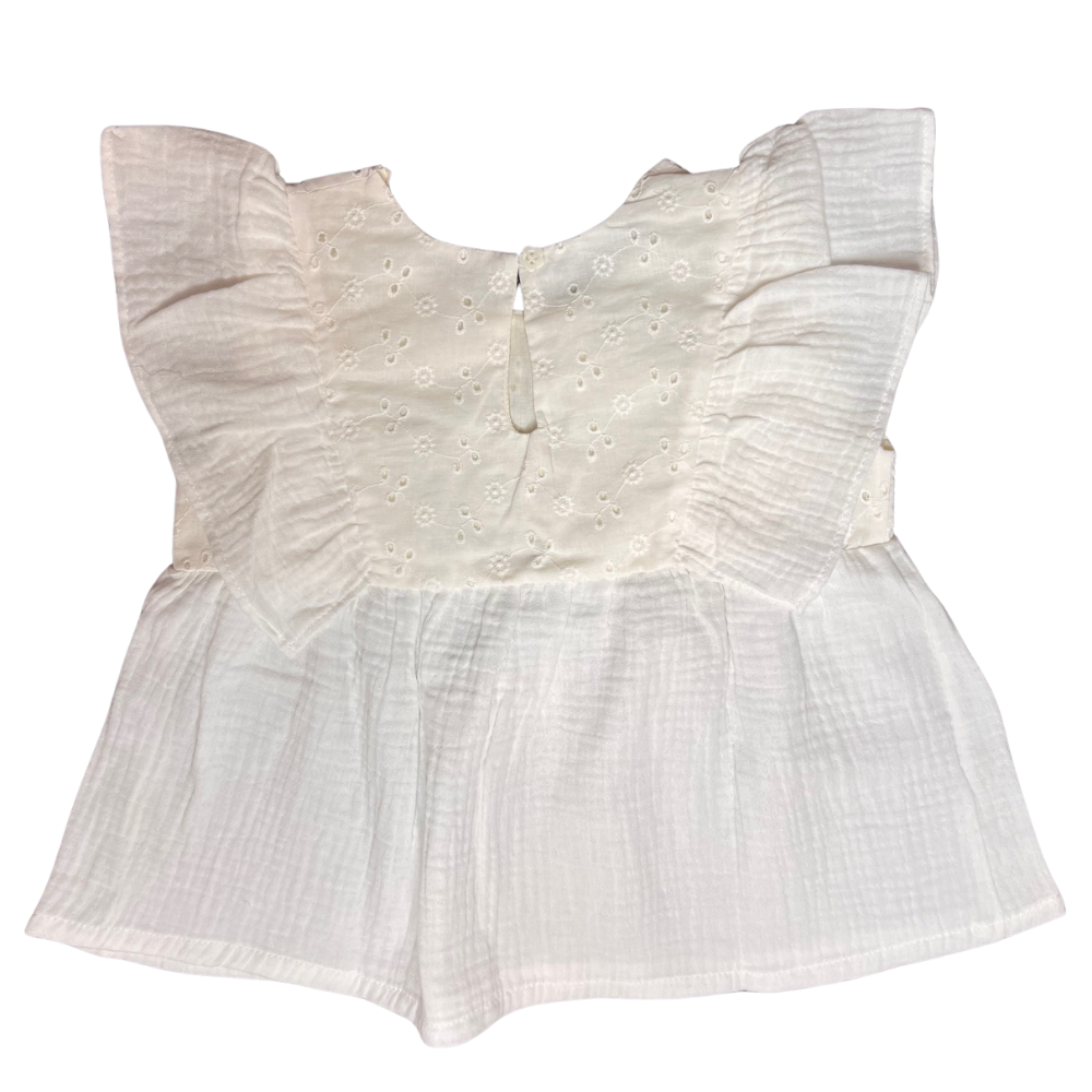 Blusa sin mangas confeccionada en suave muselina y aplicación en brodery 100% algodón, una tela liviana, transpirable y perfecta para los días cálidos, sus vuelos que abrazan los hombros le da un movimiento y un toque femenino.